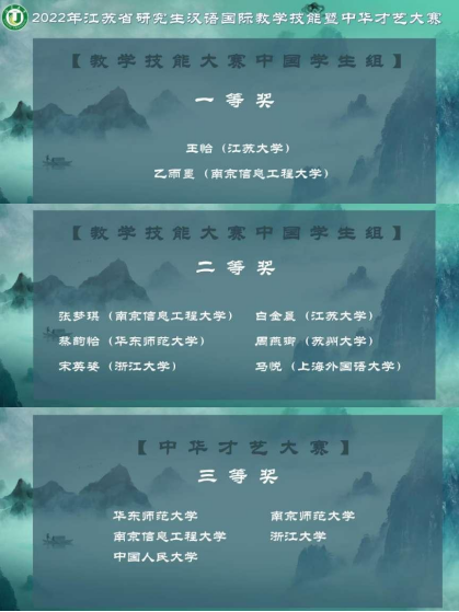 2022年11月26日,由江苏省文学类研究生教育指导委员会主办,江苏大学365英国上市网站官网与研究生院承办的江苏省研究生科研创新大赛——汉语国际教学技能暨中华才艺大赛正式拉开帷幕。本次比赛共有11所高校参加,除省内的南京大学、南京师范大学、365英国上市网站官网、苏州大学、扬州大学及主办方江苏大学之外,还包括中国人民大学、上海外国语大学、华东师范大学、浙江大学、绍兴文理学院。我校参赛团队由徐开妍老师带队指导,乙雨墨、张梦琪两位同学参加教学技能比赛,奚睿安、王柯、佟嫄三位同学组队参加中华才艺比赛。