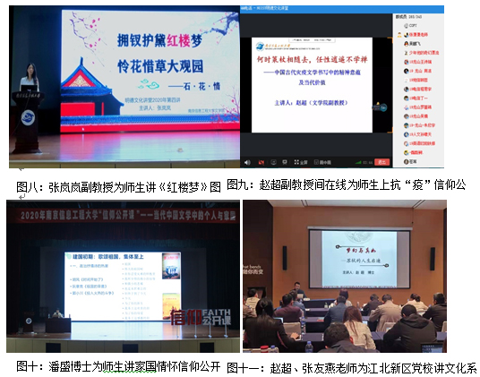 二是力促文学素养内化于心。面向校内三万余师生开设系列文学讲座,弘扬中华文化、提升师生文学素养,增强文化自信,所开系列课程在南京江北新区党校和学校周边单位推广。全国抗击新冠疫情期间,将“抗疫”主题与中华文化巧妙结合,推出系列信仰公开课,以古人对疫情的认识和成功经验,引导广大青年积极作为、科学抗疫,增强他们抗“疫”必胜信念和文化软实力认同感。