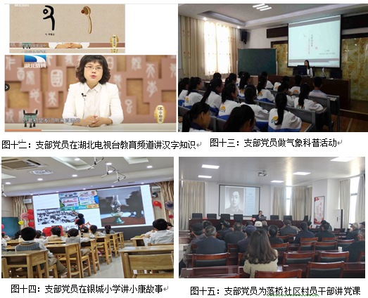 三是鼓励教师坚守三尺讲台的同时,走进社区街坊,在地方频道、小学课堂上传播文化知识。如付义琴老师应邀参加湖北电视台教育频道向全国亿万观众讲解汉字的来由和演变规律;史华娜老师利用气象科普周活动,为江阴固城中学、浦口区桥林小学学生普及文学作品中的气象小知识;张友燕老师为南京银城小学学生宣传小康知识。