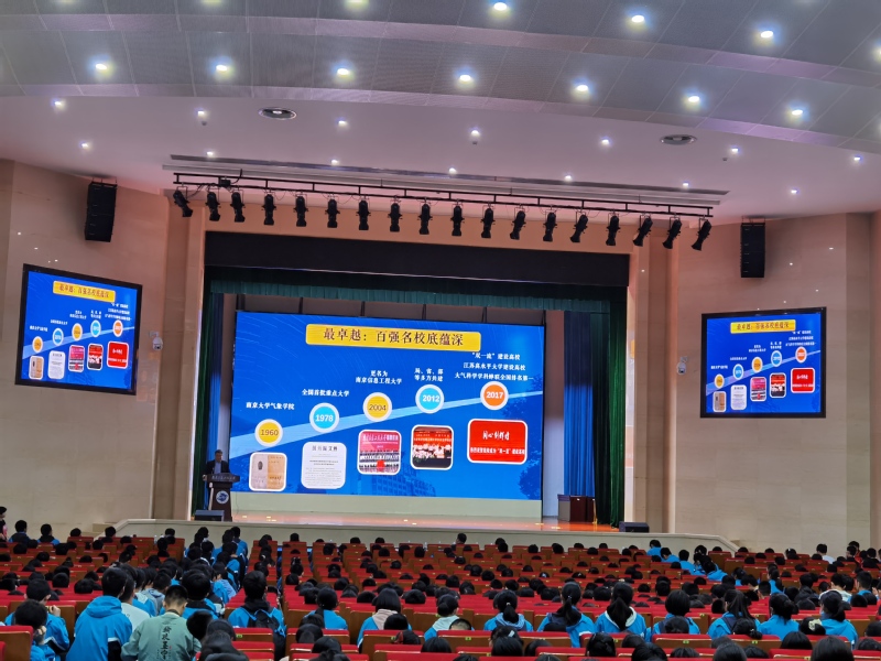 教导主任、高一年级主任姚文友代表北郊师生讲话。他说,高一年级同学从入学之初的成绩起点到如今大市期中考试后学生的发展进位,说明高一同学是优秀,有上升空间的一届。同学们要树立远大理想,努力成才。南信大是一所高水平大学,是未来同学们最理想的选择之一。