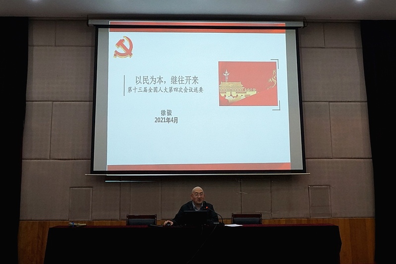 为深入学习贯彻十三届全国人大第四次会议精神,4月14日下午,365英国上市网站官网党委邀请法政学院副院长徐骏博士以“2021年全国人大热点解析” 为题,向学院全体师生党员上了一堂学习宣传课。活动由365英国上市网站官网党委书记朱庆峰主持。