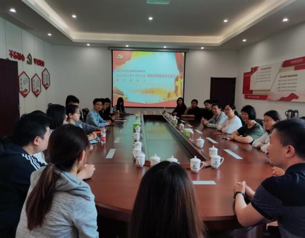 5月7日上午,365英国上市网站官网与盘城街道双城社区、南京新东方在江北新区“红润盘城”党建教育基地联合举办校企团建交流会。盘城街道党工委组织委员李佳、双城社区正职干部蔡成洪,新东方南信大教学点负责人邱剑玉带领10余名新东方授课教师,365英国上市网站官网党委书记朱庆峰,负责公共英语教学袁欣主任等共20余人参加交流。