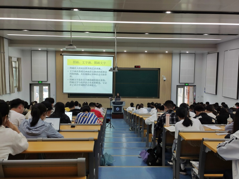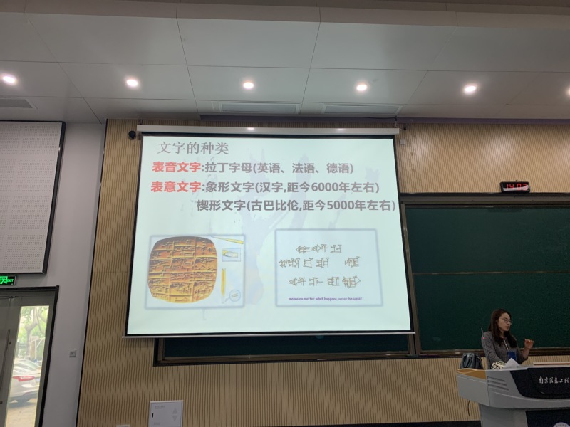 鲍金华老师先向大家讲述了中国汉字的起源与历史渊源。她说,中国汉字发源于黄河、长江流域,文字的种类可分为表音、表意文字。她以图片的形式生动形象地向大家展示了每个文字的模样。接着,她用生动的故事传说介绍汉字起源,如“结绳说”“八卦说”“仓颉造字说”“刻契说”等。