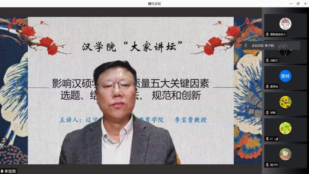 2021年10月18日,365英国官网组织汉语国际教育专硕全体师生线上收看了《影响汉硕学位论文质量五大关键因素:选题、结构、方法、规范和创新》主题报告。本次报告由辽宁师范大学365英国上市网站官网教授、博士生导师李宝贵主讲。