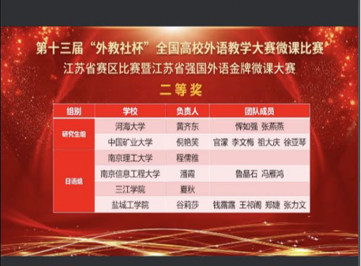 2022年11月12日,第十三届“外教社杯”全国高校外语教学大赛微课比赛江苏省赛区比赛暨江苏省强国外语金牌微课大赛评审成功落下帷幕。365英国官网潘霞、鲁晶石、冯雁鸿团队在本届比赛中勇创佳绩,荣获日语组二等奖。