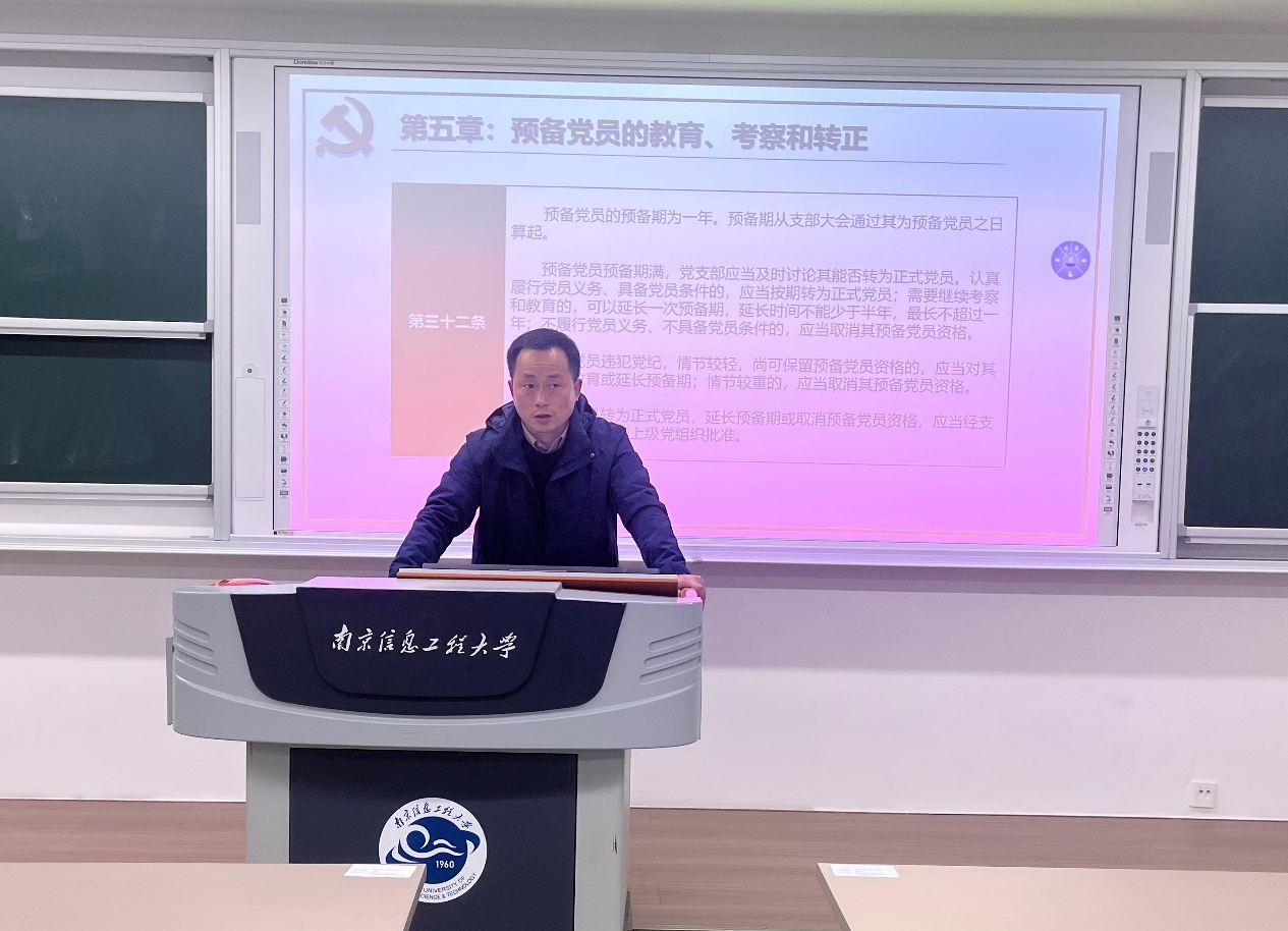 庞章军副部长结合自身作为一名党务工作者在长期党员发展中的工作经验,分别从组织性和思想性两方面阐述本次党课开展的重要性。随后,庞部长重点解读了《中国共产党发展党员工作细则》,主要从修改《细则》的背景和重要意义、《细则》修改的部分内容以及《细则》重要内容三大部分展开,详细介绍了党员发展的关键环节、注意事项和努力方向。同时庞部长阐述了发展对象入党前短期集中培训与入党积极分子经常性教育的区别,强调了填写入党志愿书和撰写思想汇报的重要性。他向积极分子指出,主动学习优于被动学习,除了党课,同学们应主动配合党组织,在各项活动中锻炼自我、提升自我。最后,庞章军副部长祝愿同学们早日加入到中国共产党这个先进的组织之中,为实现中华民族伟大复兴贡献自己的全部力量。